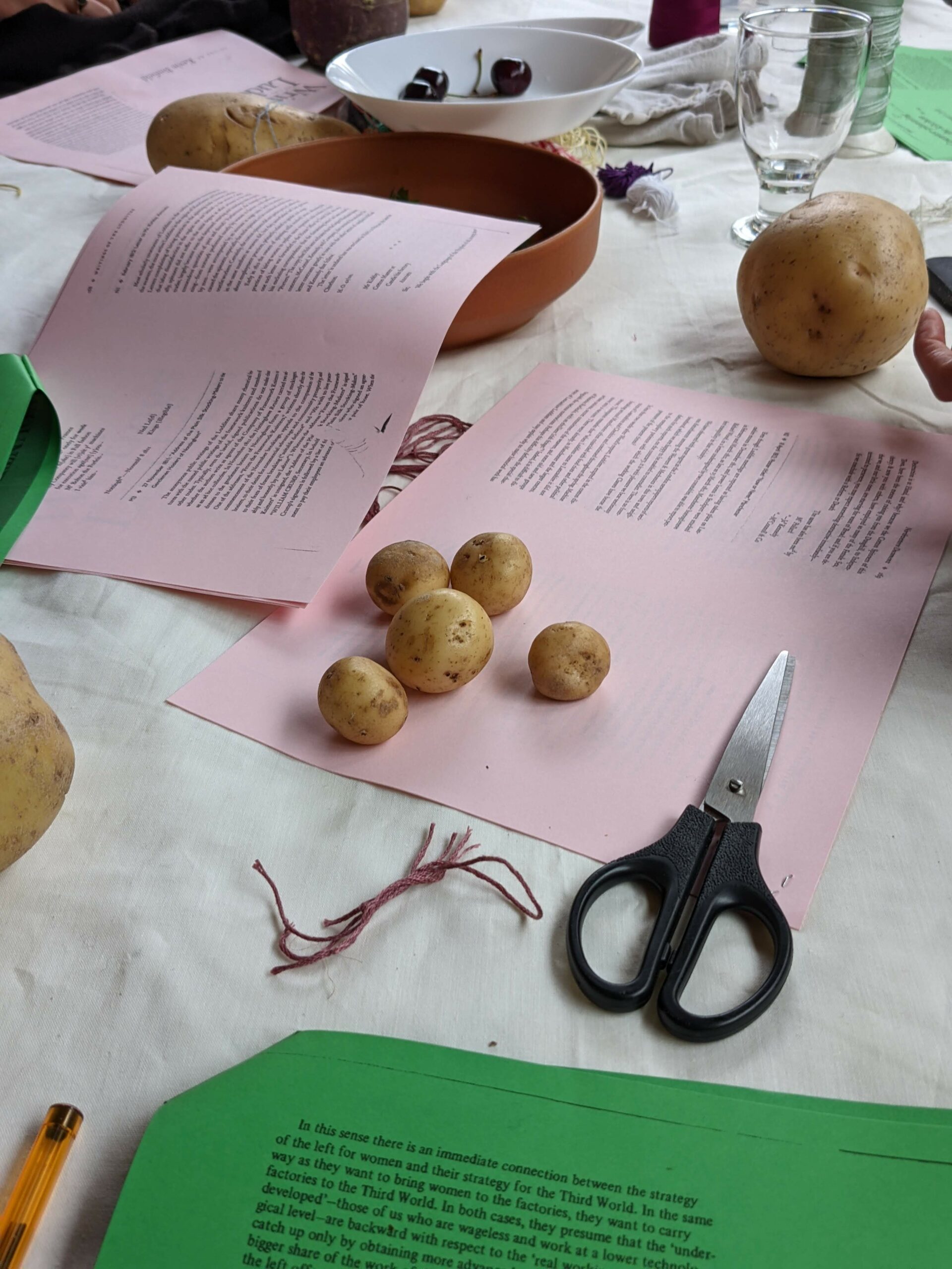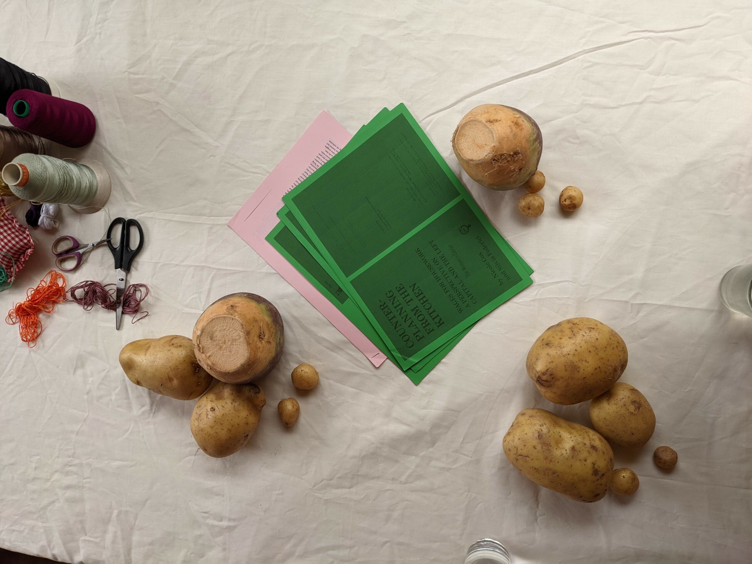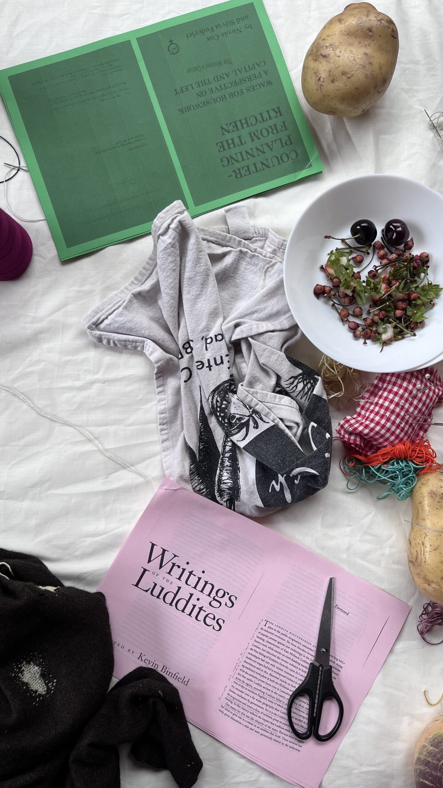 ‘Counter-planning from the Kitchen’ was a collective reading and repairing session in the kitchen of Van Gogh House London that explored historical and contemporary issues around labor and production. With the key texts “Writings of the Luddites” by Kevin Binfield and “Counter-planning from the Kitchen” by Nicole Cox and Silvia Federici, we discussed what an (appropriated) technology by and for the worker could look like while using root vegetables to (learn to) mend textiles.