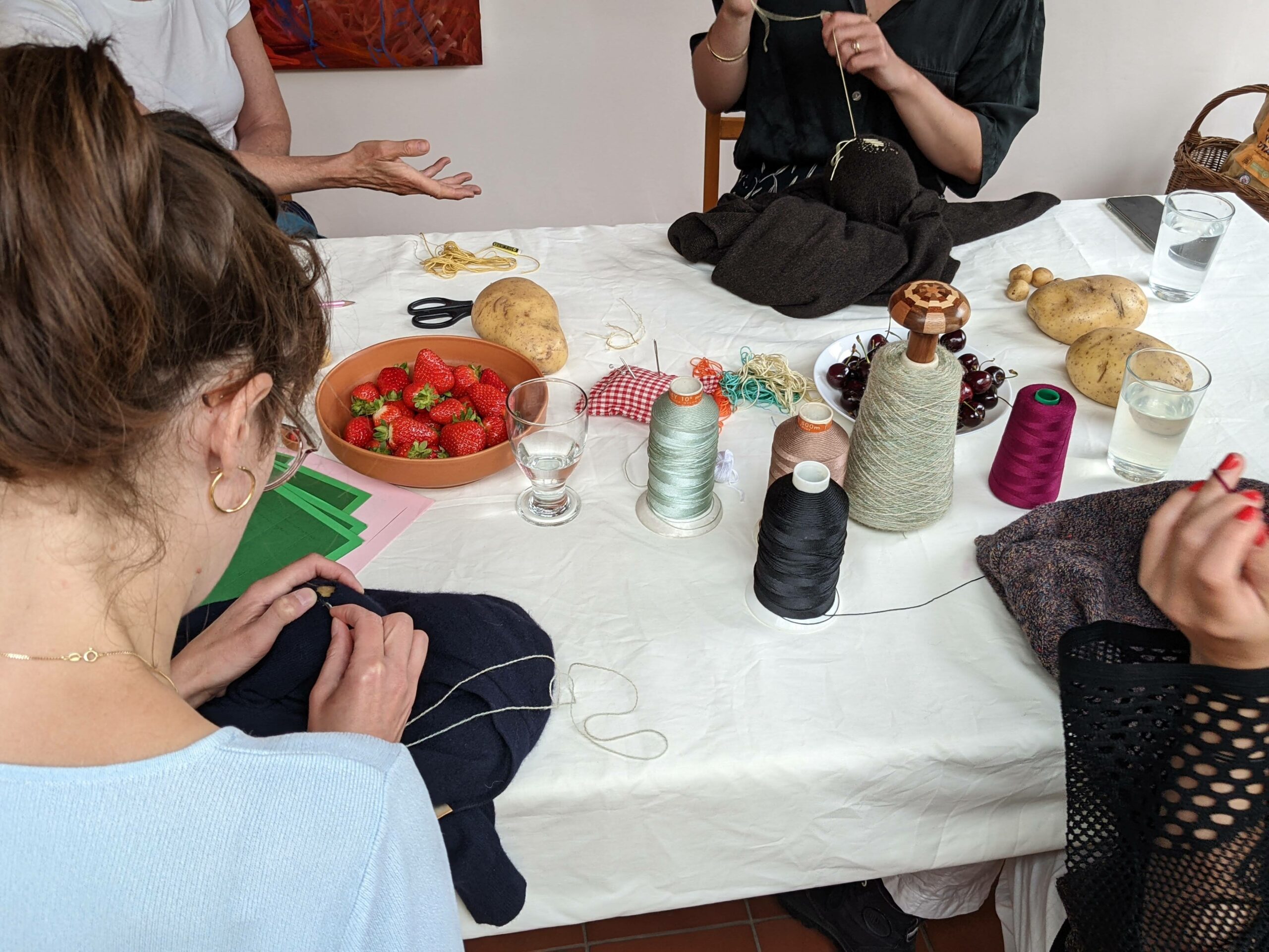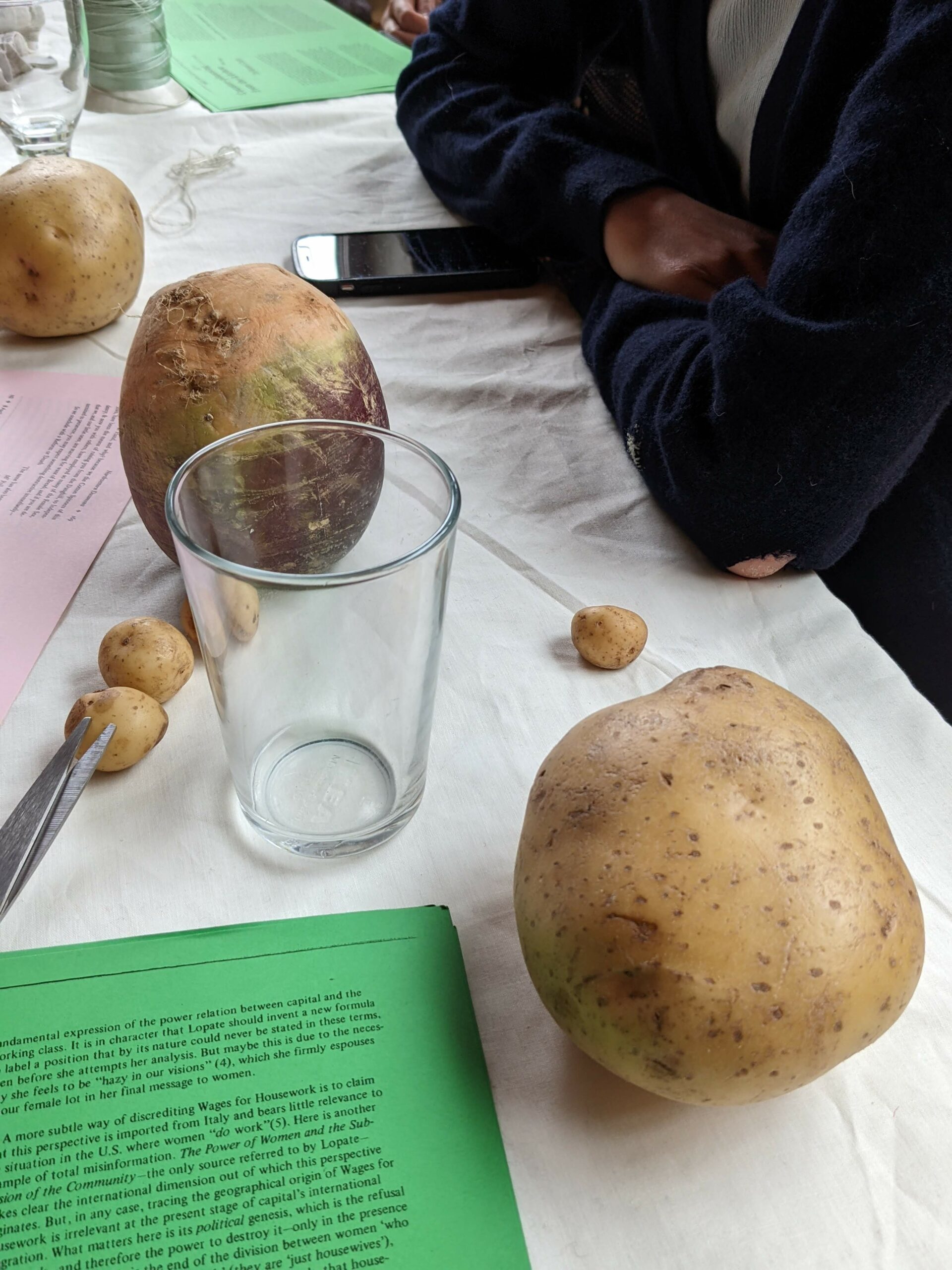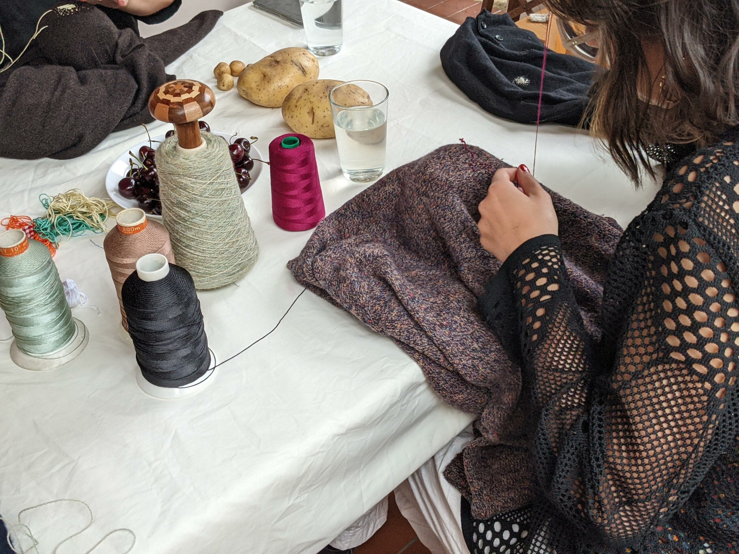 ‘Counter-planning from the Kitchen’ was a collective reading and repairing session in the kitchen of Van Gogh House London that explored historical and contemporary issues around labor and production. With the key texts “Writings of the Luddites” by Kevin Binfield and “Counter-planning from the Kitchen” by Nicole Cox and Silvia Federici, we discussed what an (appropriated) technology by and for the worker could look like while using root vegetables to (learn to) mend textiles.