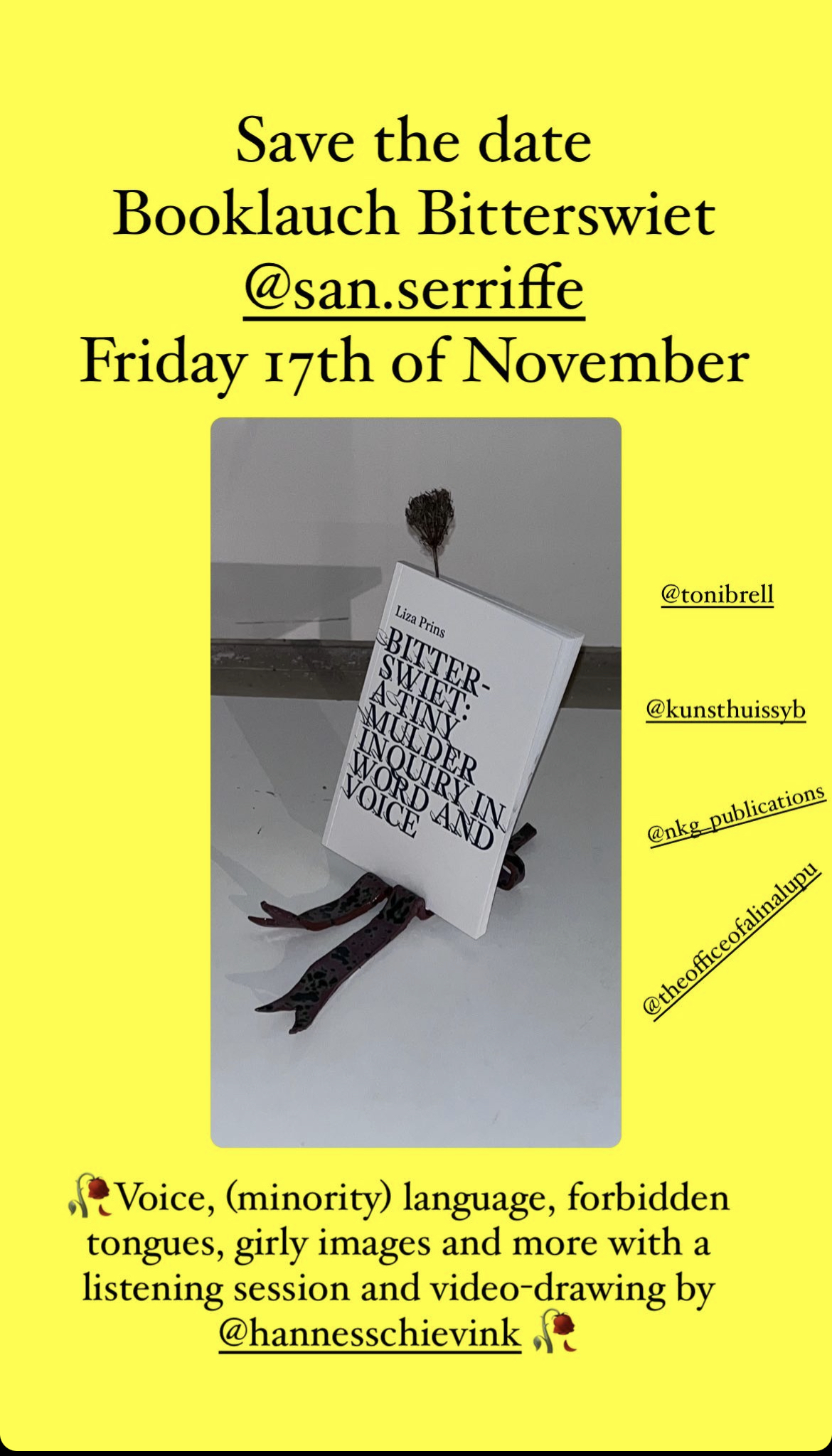 This publication was conceived as a continuation of the research performance Bitterswiet: A Tiny Mulder Inquiry in Voice and Word that started with a residency at Kunsthuis Syb in Beetsterzwaag, Friesland.