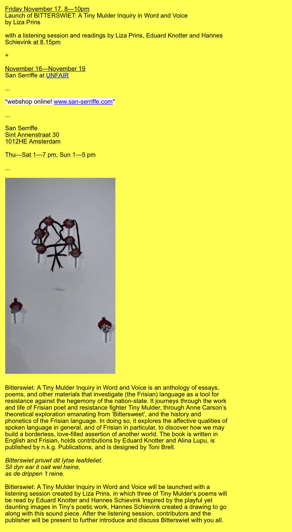 Bitterswiet: A Tiny Mulder Inquiry in Word and Voice was launched at Kunsthuis Syb on Nov. 9, 2023, and at San Serriffe on Nov. 17, 2023, accompanied by a series of ceramic sculptures and a Frisian listening session, in which recordings of Tiny Mulder’s poems read by Eduard Knotter and Hannes Schievink were accompanied by a video-drawing by Hannes Schievink.
