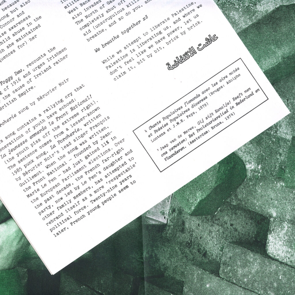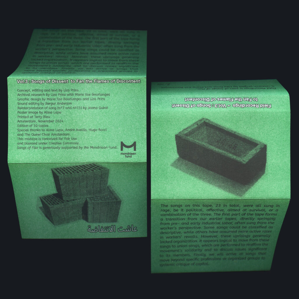 The songs on this tape, 23 in total, were all sung in rage, be it political, affective, aimed at survival, or a combination of the three. The first part of the tape forms a transition from our earlier tapes, directly springing from pre- and early industrial labor, often sung from the worker’s perspective. Some songs could be classified as descriptive, while others have assumed more active roles in workers’ revolts. However, these uprisings generally lacked organization. It appears logical to go from these songs to union songs, which are performed to reaffirm the movement’s solidarity and to discuss issues significant to its members. Finally, we will arrive at songs that move beyond specific professions or organized groups to systemic critique of capital and empire. The songs on this tape often know many originals and more reiterations. These reiterations can transform the song’s meaning, discover precedents in previous struggles, and introduce cross-historical forms of solidarity while the lyrics change frequently. The songs are alive, and because it makes no sense to try to trace genealogies to a single source among them, we have included the version whose connotations in its use spoke most to us or the version that we enjoyed listening to the most, which – better put – persuaded us the most.